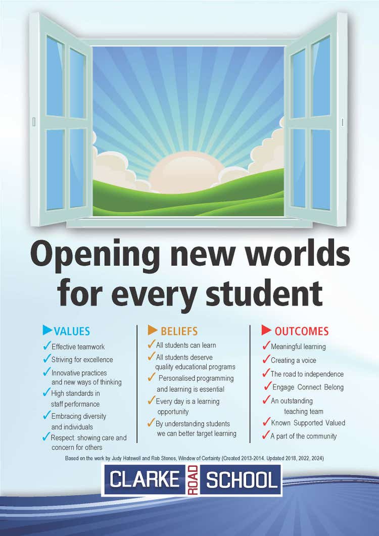 This is our Window of Certainty poster that drives much of what we do here at Clarke Road School. It is displayed in all our classrooms and is an integral part of the school. It was developed over a number of years in consultation with families, School Learning Support Officers and teachers.